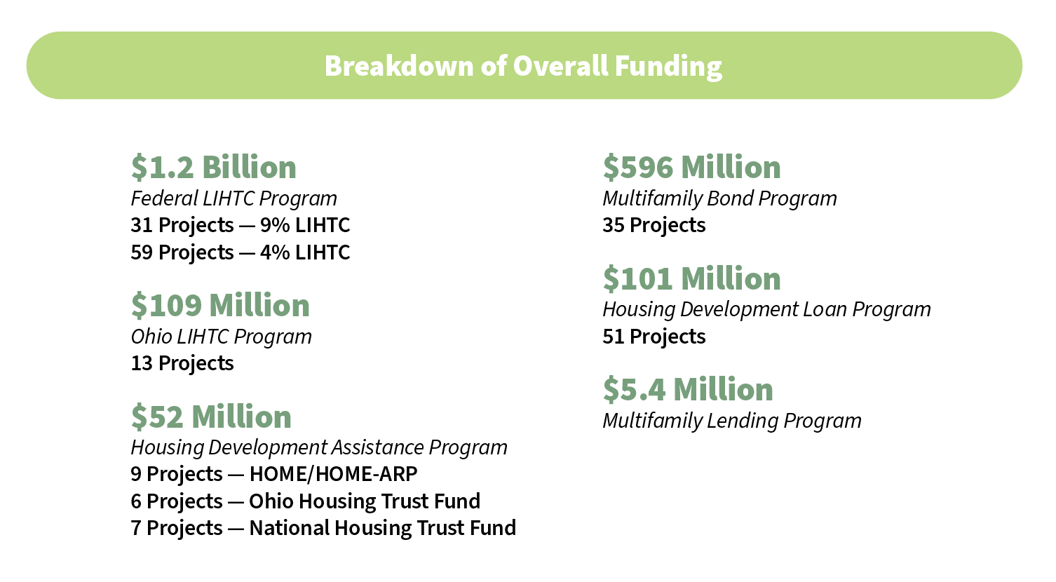 * In order to make affordable housing developments financially feasible, OHFA may provide a single project funding from more than one program. The data above breaks down how many projects received funding from an individual source. The total number of developments OHFA funded in FY25 is 116.